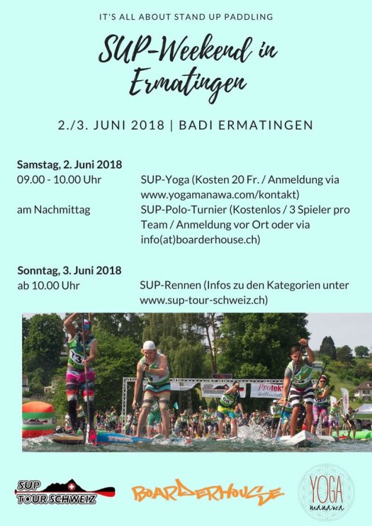 Am 2. und 3. Juni 2018 macht die „SUP Tour Schweiz“ Halt in der Badi Ermatingen. Am Samstagmorgen (2. Juni) biete ich SUP-Yoga von 09.00 bis 10.00 Uhr an. Am Samstagnachmittag organisiert das Boarderhouse ein SUP-Polo-Turnier. Am Sonntag folgen dann die SUP-Rennen über 5km und 12km (rund um die Insel Reichenau).